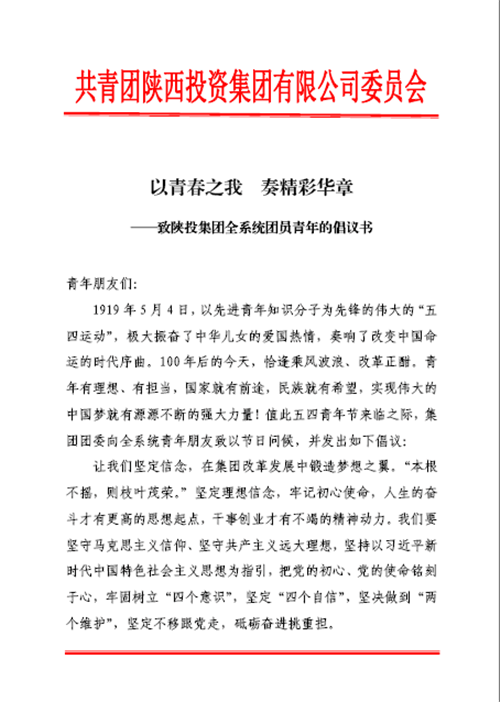 | 以青春之我 奏精彩华章--致陕投集团全系统团员青年的倡议书 |