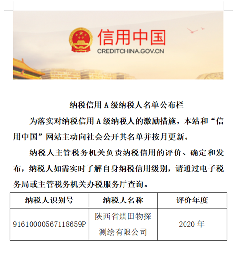 近日,在国家税务局新城区分局开展的2020年度纳税信用等级评定工作中,物测公司再次荣获“A级纳税人”称号。这是公司自2016年以来连续五年获此殊荣,是对公司纳税工作扎实开展的再次充分肯定。